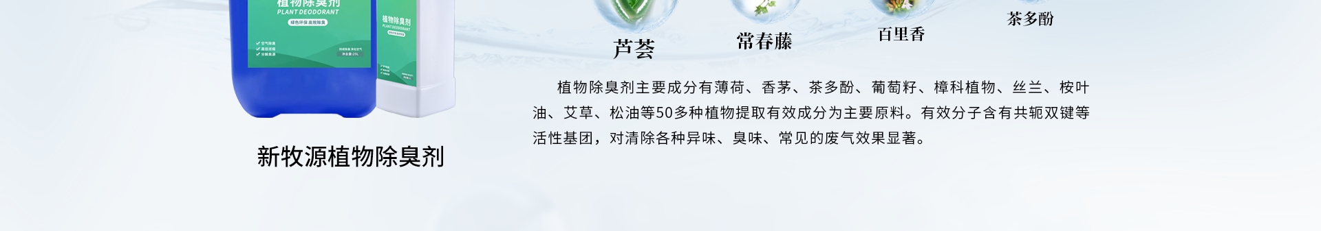 從天然植物中分離提取的天然成分,具有抑菌、殺菌和除臭功效,對氨、硫化氫等無機(jī)物和低分子脂肪酸、胺類、醛類、酮類、醚類、鹵代烴等有機(jī)物等惡臭有吸附、遮蓋、良好的分解,或者與異味分子發(fā)生碰撞, 進(jìn)行反應(yīng),促使異味分子發(fā)生改變原有分子結(jié)構(gòu), 使之失去臭味,達(dá)到去除臭味的效果。